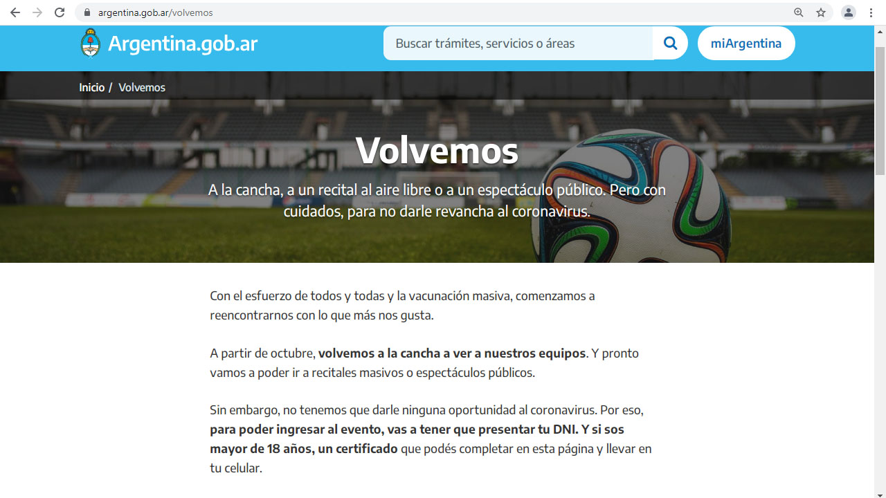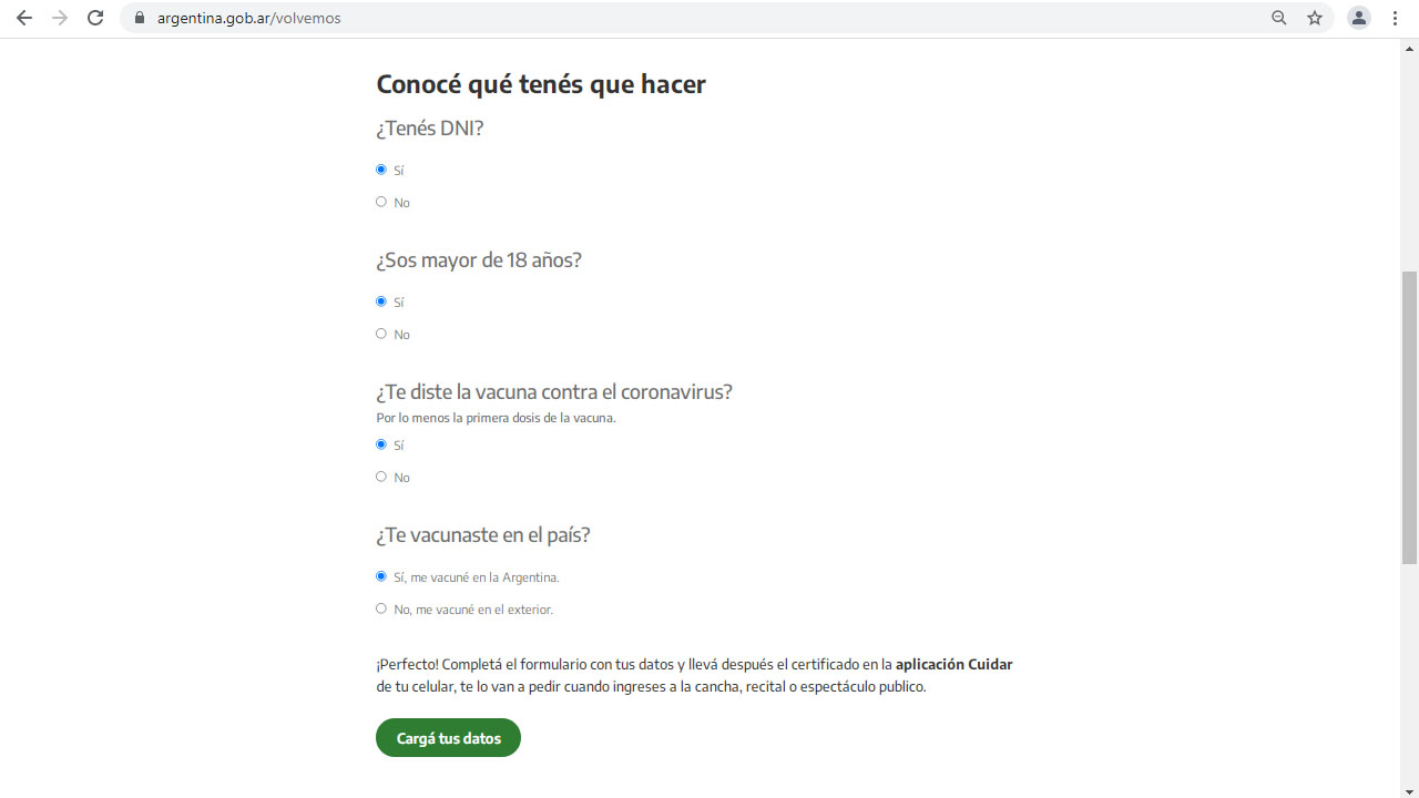 Así, quedó establecido que todos los hinchas deberán ingresar a argentina.gov.ar/volvemos y llenar el formulario con los datos personales, a modo de declaración jurada.