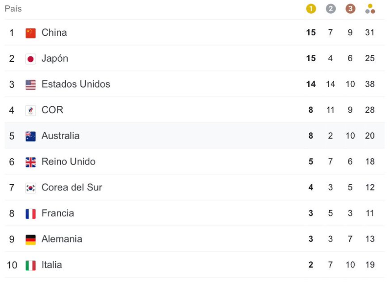 China continúa como líder del medallero gracias a sus 15 medallas doradas, la misma cantidad que Japón, al que supera en cantidad de medallas de plata, en los Juegos Olímpicos Tokio 2020.