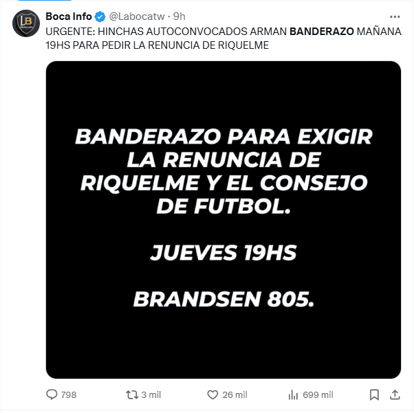 Autoconvocados por redes sociales con los lemas de “Boca es su gente” y “#RenunciaRiquelme”, el grupo de simpatizantes pidió “que se vayan todos” y “que no quede uno sólo”, además de distintos insultos hacia la comisión directiva de la institución.
