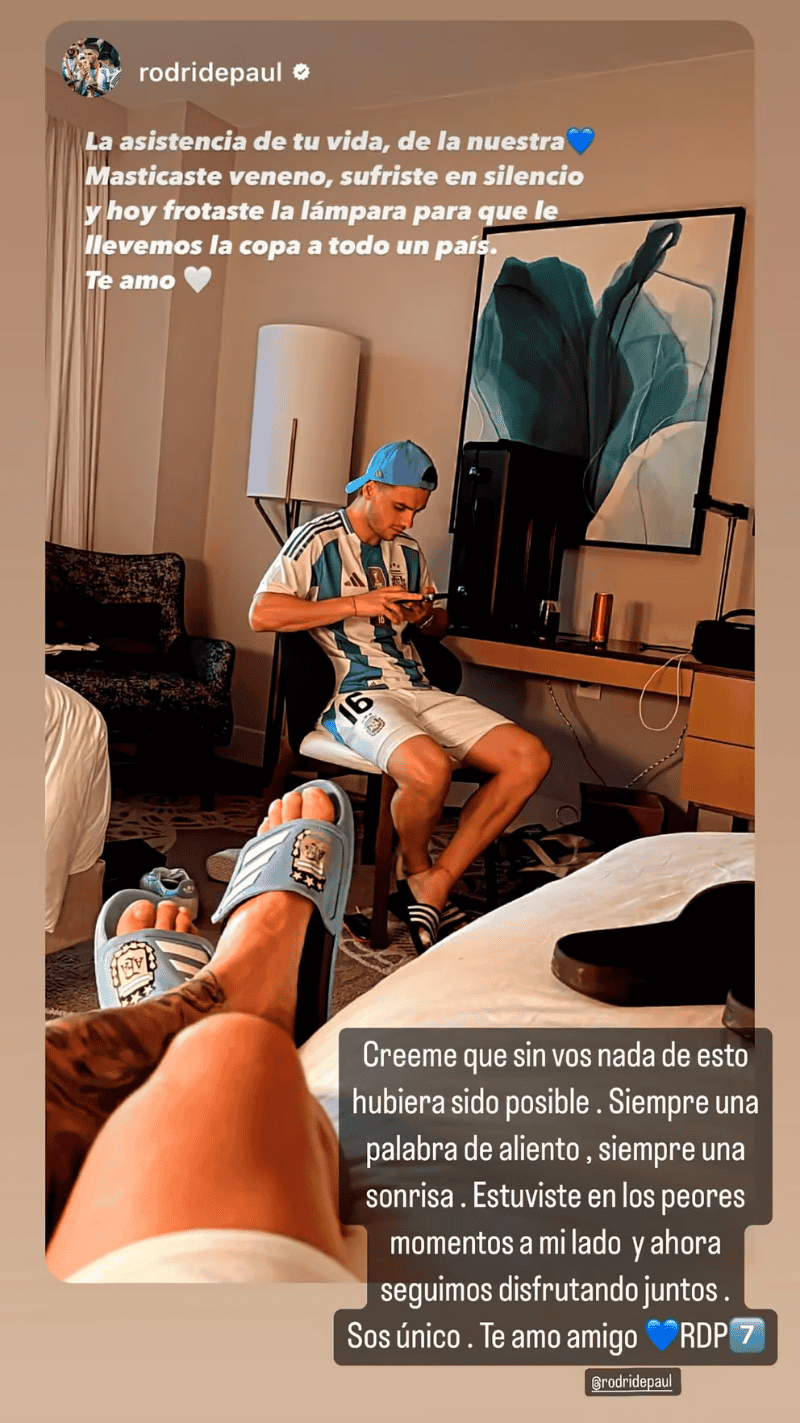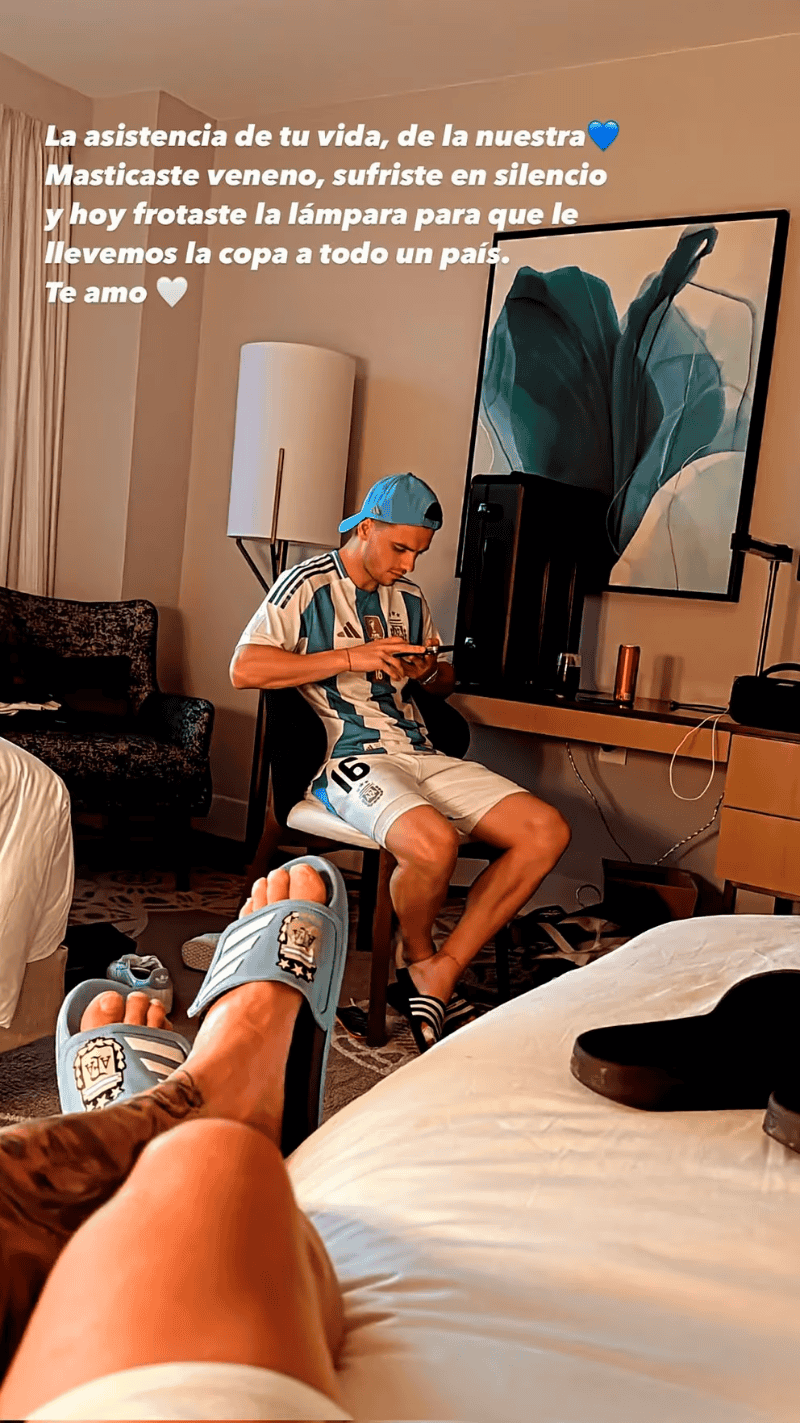 "La asistencia de tu vida, de la nuestra. Masticaste veneno, sufriste en silencio y hoy frotaste la lámpara para que le llevemos la Copa a todo un país. Te amo", escribió e hizo referencia al duro momento que pasó el ex Rosario Central en 2022, cuando se perdió el Mundial de Qatar por una lesión.