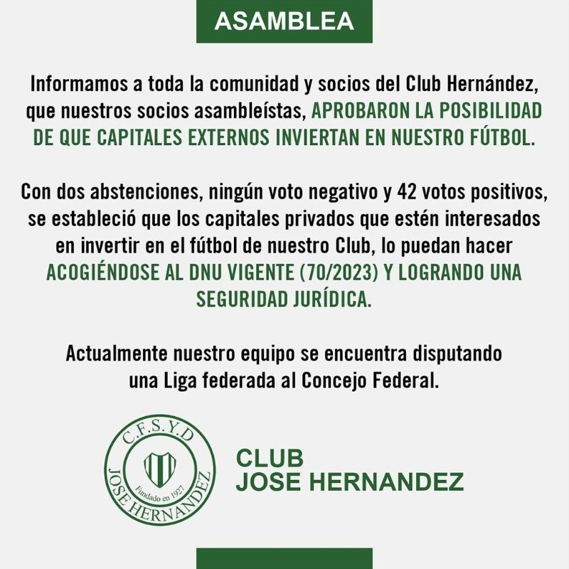 “Informamos a toda la comunidad y socios del Club Hernández, que nuestros socios asambleístas, aprobaron la posibilidad de que capitales externos inviertan en nuestro fútbol. Con dos abstenciones, ningún voto negativo y 42 votos positivos, se estableció que los capitales privados que estén interesados en invertir en el fútbol de nuestro club, lo puedan hacer acogiéndose al DNU vigente (70/2023) y logrando una seguridad jurídica. ¿Por qué lo aprobamos? Entendemos que los inversores privados para fomentar los clubes pueden aportarnos crecimiento institucional, deportivo, generación de recursos genuinos y la posibilidad de más y mejor trabajo. ¿Qué pasa con nuestro rol social? Acá es importante que aclaremos que el rol social de nuestro club no cambia, lo que cambia es nuestra manera de desarrollarnos comercialmente. ¿Qué van a tener a cambio los privados que inviertan? Van a obtener una rentabilidad que nuestro club va a conseguir a través del fútbol mediante el atractivo generado por más y mejores deportistas, más actividades, mejores sedes, mejores resultados y principalmente más y mejores servicios. ¿Puede nuestro equipo seguir participando en la Liga? Sí, claro. El DNU dice que las diferentes organizaciones rectoras del deporte en nuestro país no podrán “impedir, dificultar, privar o menoscabar cualquier derecho a una organización deportiva, incluyendo su derecho de afiliación a una confederación, federación, asociación, liga o unión’. Es decir, las organizaciones deben modificar sus estatutos para permitir la afiliación de un club que sea SAF (Sociedad Anónima Futbolística). Actualmente nuestro equipo se encuentra disputando una Liga federada al Consejo Federal”.