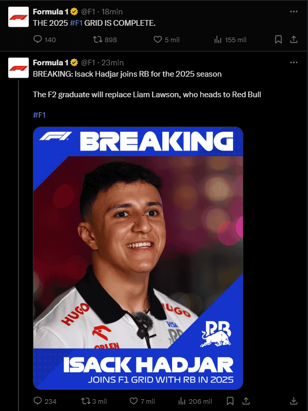 “ÚLTIMA HORA: Isack Hadjar se une a RB para la temporada 2025. El graduado de F2 reemplazará a Liam Lawson, quien se dirige a Red Bull”, escribió la cuenta oficial de X de la Fórmula 1, para anunciar la elección de Racing Bulls.