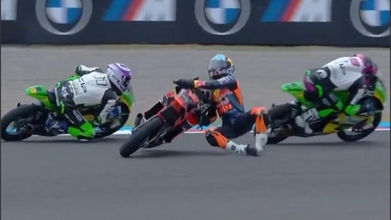 El piloto argentino de Red Bull KTM se mantuvo entre los 15 primeros puestos durante toda la carrera y hasta en un momento se ubicó en el séptimo lugar, pero un roce con el británico Scott Ogden (KTM) provocó que perdiera el control y terminara derrapando en la última vuelta.
