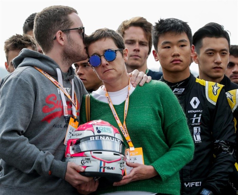 Todos los pilotos de las diferentes categorías presentes en Spa –donde, lógicamente, se suspendió la segunda carrera de F2, prevista para este domingo– se colocaron detrás de la madre y del hermano del piloto fallecido, que sujetaban su casco; y guardaron un sentido minuto de silencio en la recta de meta del mítico circuito de las Árdenas.