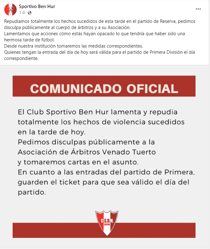 Desde el club Sportivo Ben Hur emitieron un comunicado en sus redes sociales el cual repudia “totalmente los hechos sucedidos esta tarde en el partido de Reserva, pedimos disculpa públicamente al cuerpo de árbitros y a su Asociación. Lamentamos que acciones cómo estás hayan opacado lo que tendría que haber sido una hermosa tarde de fútbol”.