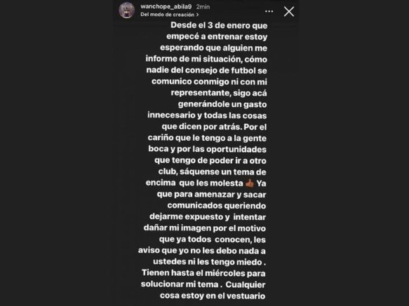 Wanchope estalló en su cuenta de Instagram donde publicó un contundente mensaje: “Desde el 3 de enero que empecé a entrenar estoy esperando que alguien me informe de mi situación. Como nadie del Consejo de Fútbol se comunicó conmigo ni con mi representante, sigo acá generándole un gasto innecesario y todas las cosas que dicen por atrás”, lanzó en sus historias.