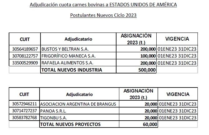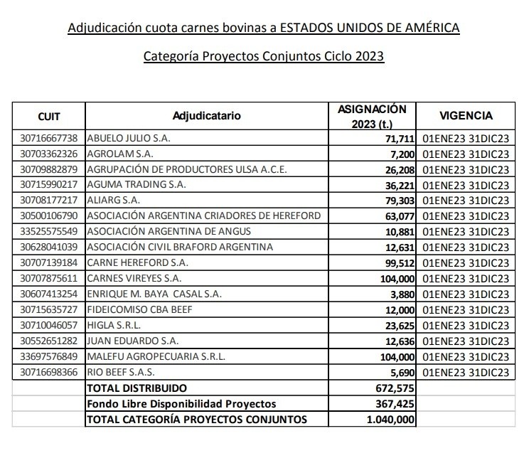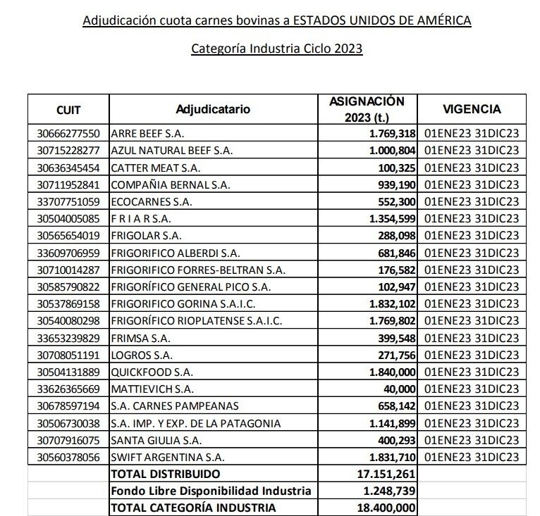 La resolución 48/2023 de la Secretaría de Agricultura, Ganadería y Pesca de la Nación publicada este miércoles, estableció los diferentes cupos para la exportación de carne vacuna hacia Estados Unidos.