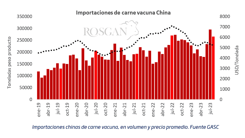 En los primeros ocho meses del año, China ha realizado compras por un valor total de aproximadamente 9.600 millones de dólares, lo que representa una disminución del 16% en comparación con el año anterior. En términos unitarios, el precio promedio de la carne importada en agosto fue de USD 5.350 por tonelada, un 20% inferior al precio registrado hace un año. Esto se produce en un contexto en el que la demanda estaba experimentando un fuerte repunte tras la pandemia, sin anticipar las estrictas medidas de control que eventualmente paralizarían la actividad en los meses siguientes.