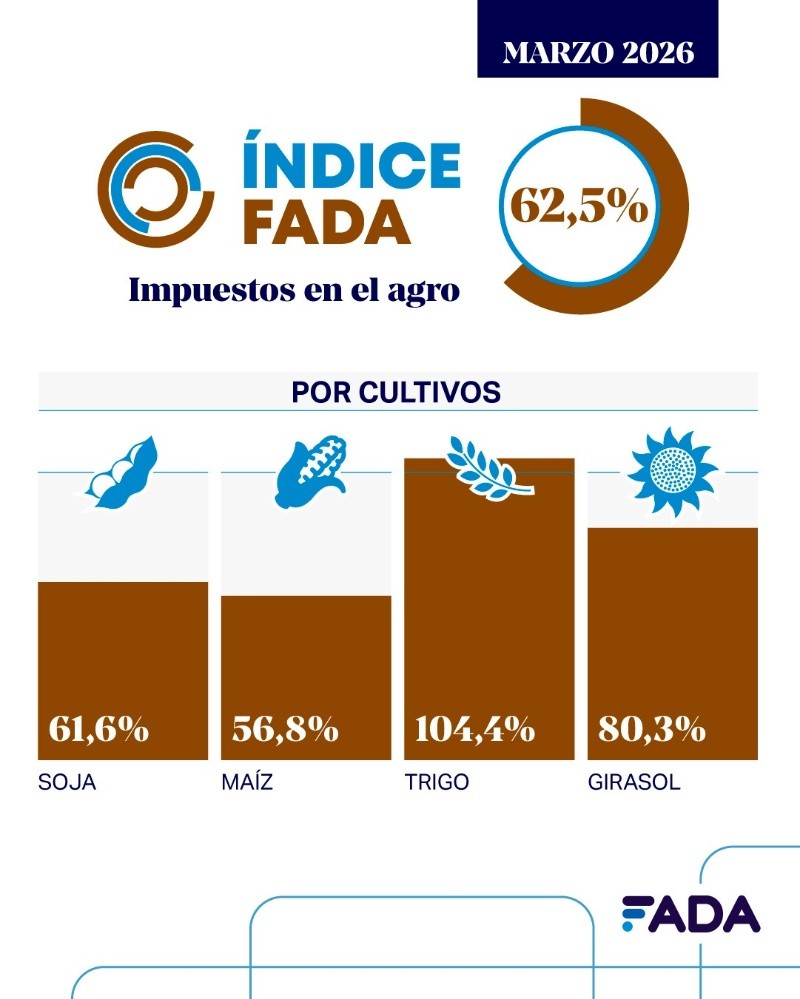 El Índice FADA de marzo 2026 marca que el 62,5% de la renta se va en impuestos, 6,1 puntos porcentuales más que diciembre de 2025. Esto significa que, de cada $100 que genera una hectárea agrícola, $62,5 se destinan a impuestos nacionales, provinciales y municipales. Mientras el promedio nacional es de 62,5%, Córdoba registra un 60,2%, Buenos Aires 60,4%, Santa Fe 57%, La Pampa 60,4%, Entre Ríos 67,6% y San Luis 55,7%.