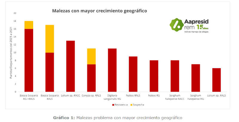 Especies como Conyza sp., Amaranthus sp, Eleusine indica, Echinochloa colona o Sorghum halepense resistentes a glifosato muestran presencia en la mayor parte de la superficie agrícola del país.