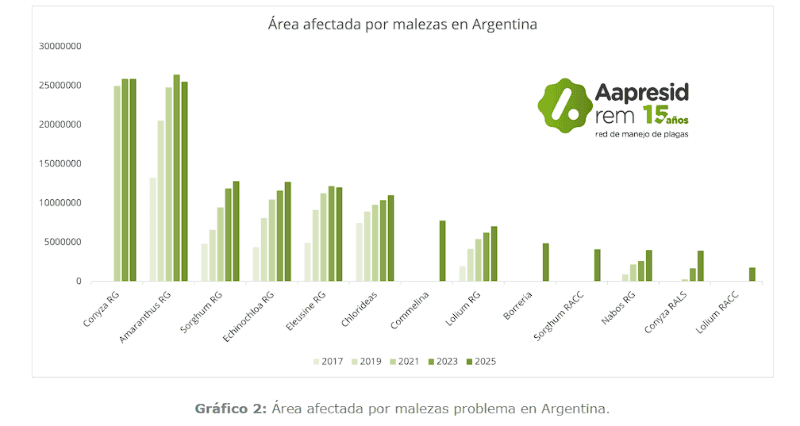 Por su parte, los biotipos de Sorghum halepense y Lolium sp. resistentes a graminicidas dicen “presente” en 4.1 y 1.8 millones de Ha, respectivamente, siguiendo los pasos a sus versiones resistentes al glifosato.