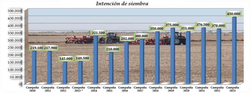 Cabe remarcar que la intención de siembra de trigo alcanzaría las 450.000 ha, por lo que registraría un incremento de 80.000 ha con respecto a las implantadas el año anterior, que fueron 370.000, por lo que se cubriría desde un 18 a un 20 % más de superficie.