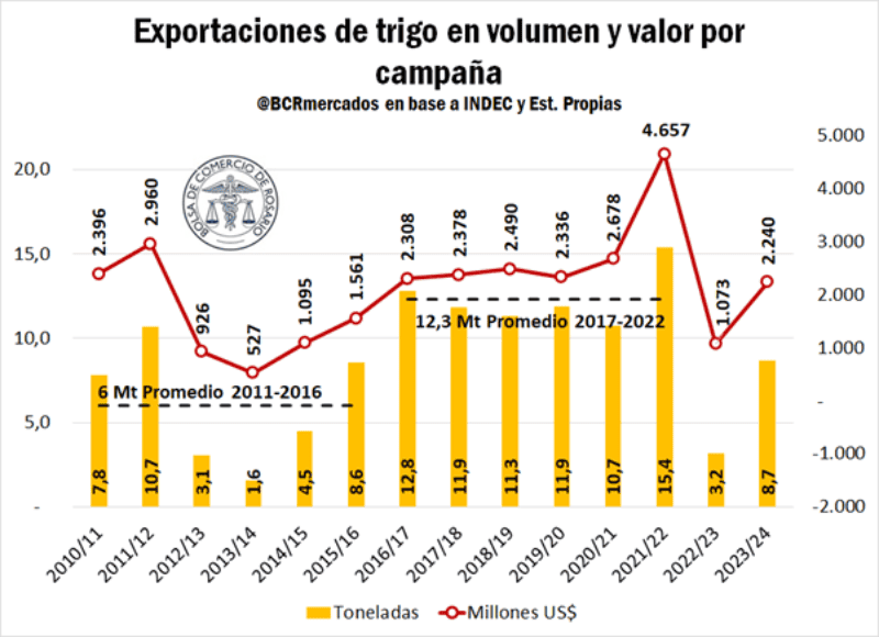 "De esta manera, a pesar de la magra producción triguera 2023/24, las exportaciones se recuperarían para alcanzar los mencionados 8,7 Mt", indicaron los expertos de la BCR, Tomás Rodríguez Zurro y Emilce Terré. Si bien este número queda lejos de los más de 12 Mt que Argentina exportó, en promedio, en los 5 años previos (2017-2022), queda muy por encima de los 3,2 Mt enviados al exterior en el ciclo que finaliza.