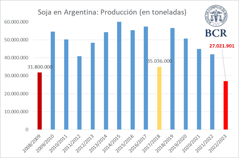 Argentina sufre un escenario climático sin precedentes en la agricultura moderna. Con un nuevo recorte de 7,5 Mt se actualiza el número de producción de soja a 27 Mt. De esta manera, de acuerdo a las estimaciones de la Bolsa de Comercio, se estima que ya se ha perdido el 45% de la producción esperada al inicio de la campaña. El guarismo de marzo deja al ciclo 2022/23 como la peor cosecha de las últimas 15 campañas, quedando incluso muy por debajo de la 2008/09 (31,8 Mt).