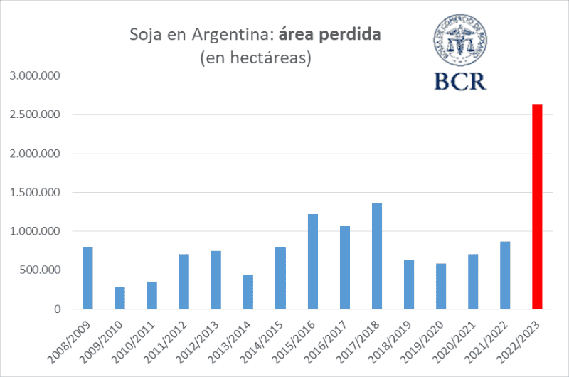 Se estima en 2,6 M ha la superficie sembrada con soja que podría no cosecharse en el 2022/23. Se trata de un nuevo récord que marca la brutal sequía que sigue sufriendo nuestro país. El área perdida duplicaría el récord previo, el de 2017/18, cuando no se habrían cosechado 1,3 M ha. Lamentablemente, se advierte que ante el actual escenario de pérdidas masivas y sin perspectivas de un cambio radical en los pronósticos climáticos en gran parte de la región pampeña, la cifra podría quebrar en breve el nivel de 3 M ha.