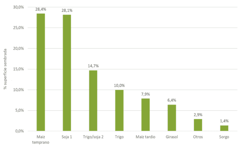 La proyección de áreas es la siguiente: maíz temprano 28,4%, soja de primera 28,1%, trigo/soja de segunda 14,7%, trigo 10%, maíz tardío 7,9%, girasol 6,4% y otros cultivos 2,9%.