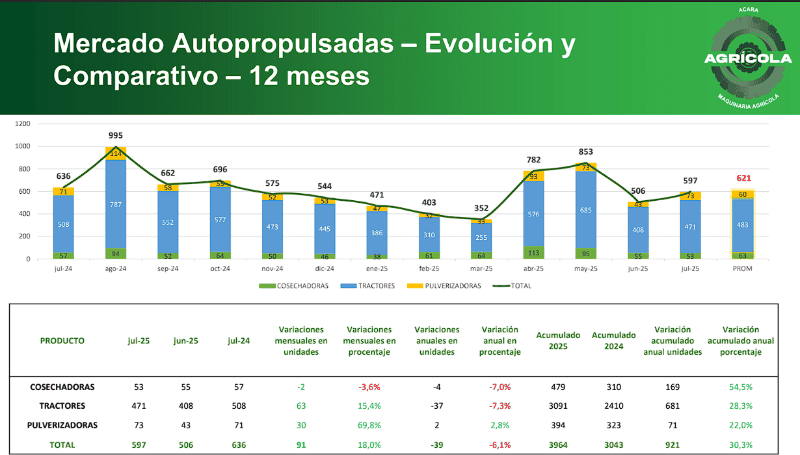 La División de Maquinaria Agrícola la Asociación de Concesionarios de Automotores de la República Argentina (ACARA) confirmó que los patentamientos de cosechadoras, tractores y pulverizadoras de julio de 2025 alcanzaron las 597 unidades, una baja del 6,1% interanual ya que en julio de 2024 se habían registrado 636. Si la comparación es con su antecesor mes de junio se observa una suba del 18%, ya que en ese mes se habían patentado 506 unidades.