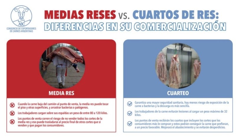 Por eso, el Consorcio de Exportadores de Carnes Argentinas (ABC) volvió a insistir con la necesidad del cuarteo de la carne, que “llega precisamente para modernizar un sistema que continúa con métodos antiguos y obsoletos, de una época que debe quedar atrás”. Cabe remarcar que la iniciativa oficial entrará en vigencia a partir del 1 de noviembre y ha generado mucha polémica entre los distintos actores de la industria frigorífica.