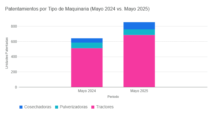 La División de Maquinaria Agrícola la Asociación de Concesionarios de Automotores de la República Argentina (ACARA) confirmó que los patentamientos de cosechadoras, tractores y pulverizadoras de mayo de 2025 alcanzaron las 853 unidades. De esta manera, se registró una suba del 33,1% interanual teniendo en cuenta que en mayo de 2024 se habían comercializado 641.