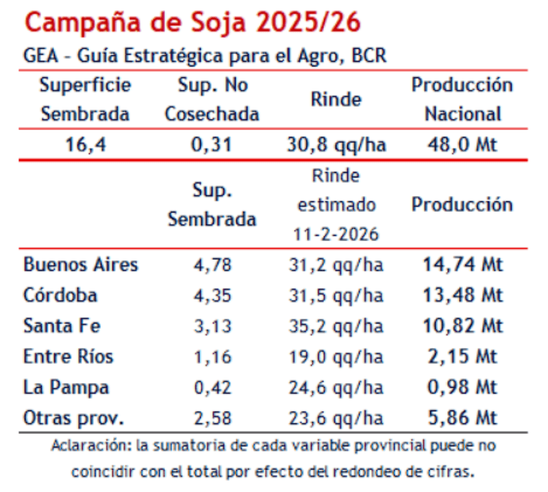 El rinde nacional estimado para soja es de 30,8 quintales por hectárea, y la proyección de producción se basa en un área sembrada y en condiciones de cultivo que muestran variabilidad geográfica. Si bien la cifra sigue siendo elevada en términos históricos, el resultado es una señal de ajuste productivo frente a las condiciones climáticas cambiantes y la competencia por hectáreas con otros cultivos.