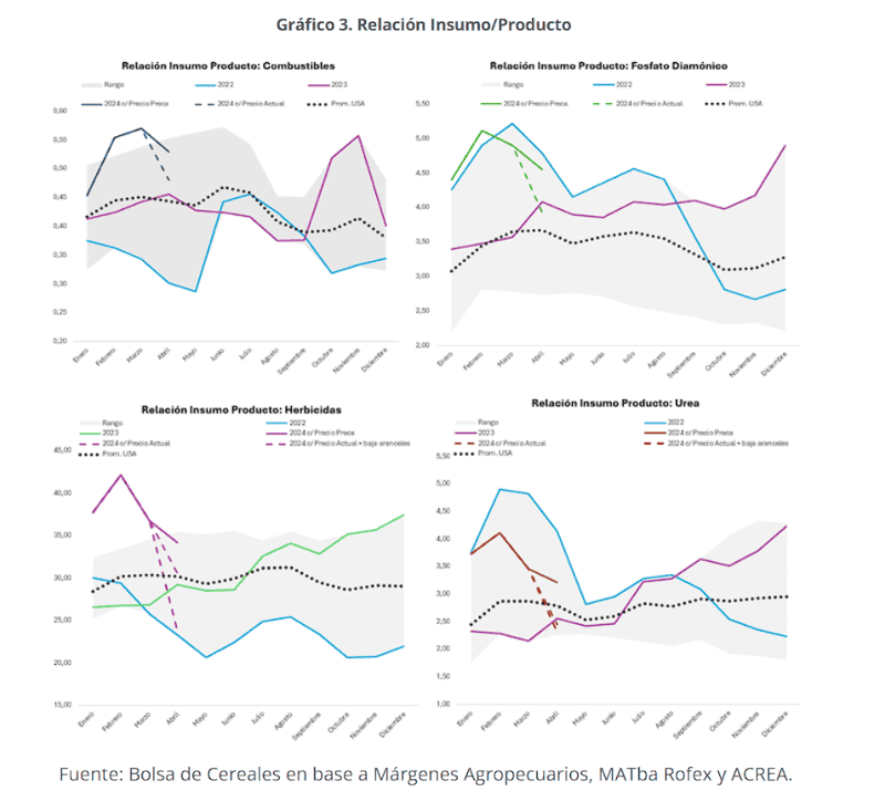 La mejora en los precios de los granos y la caída en los costos de producción ha generado una mejora en la relación insumo/producto en todos los casos. Inicialmente, los combustibles y el fosfato diamónico presentaban una relación de 0.53 y 4.55 respectivamente, pero tras los cambios en los precios, el ratio mejoró un 9% y 14% respecto al Lanzamiento de Pre Campaña, aunque aún supone una desmejora del 9% y 7% en comparación con el promedio de las últimas 5 campañas. Por otro lado, la urea y los herbicidas, como el 2,4 D, tenían una relación de 3.22 y 34.16 antes de los cambios, pero con los nuevos precios esta cifra mejoró un 24% y 11%, respectivamente. Además, el Decreto 384/24, emitido el lunes 3 de mayo, redujo los aranceles de diversos productos, entre ellos estos dos insumos. Por lo tanto, se quita el arancel del 5.4% para la urea y algunos herbicidas pasaron del 35% al 12.6%. Esto llevaría a una mejora del 17% y 22% en las relaciones respecto al promedio de las ultimas 5 campañas.