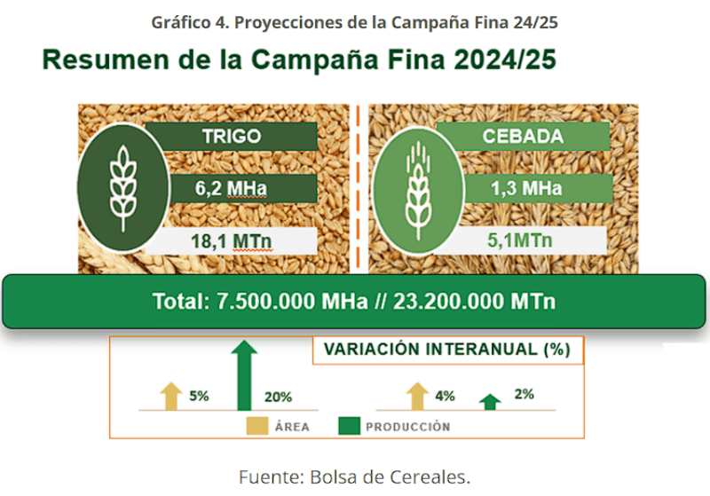 Bajo este contexto, se espera que el área sembrada de trigo para la campaña 24/25 alcance los 6,2 millones de hectáreas, con una producción estimada en 18,1 millones de toneladas. Esto representaría un aumento del 5% en área y del 20% en producción respecto a la campaña anterior. Por su parte, la superficie destinada a la cebada se ubique en 1,3 millones de hectáreas, con una producción estimada de 5,1 millones de toneladas, lo cual supone un incremento del 8% y del 2%, respectivamente.