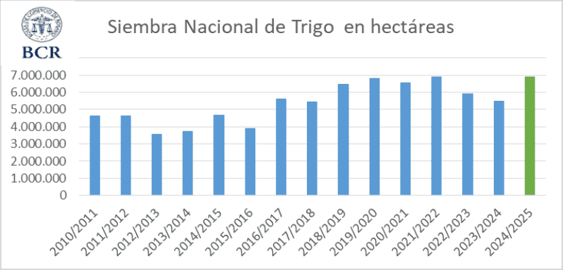 Según el Director de la Guía Estratégica para el Agro, Cristian Russo, el área sembrada proyectada para el nuevo ciclo es de 6,92 millones de ha, por lo que podría constituirse un récord en caso de materializarse. "El incremento sería de 25% frente al año pasado; considerando las últimas 15 campañas, se pasaría de la que fue la octava menor siembra de trigo en el 2023 a la que puede ser la campaña más importante", subrayó.