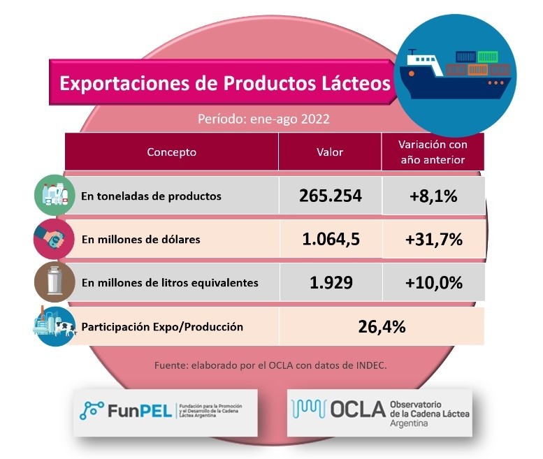 En litros de leche equivalentes, las exportaciones crecieron el 10% y representaron en el período enero-agosto del año 2022, el 26,4% de la producción total.