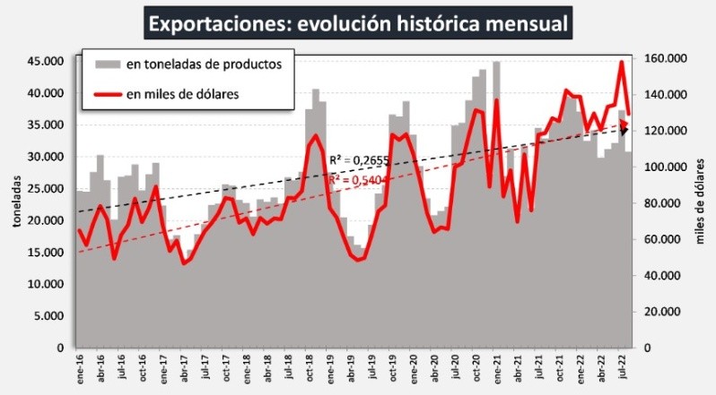 La variación intermensual de las exportaciones fue de +17,5% en volumen y de +18,2% en valor (ago/22 vs. jul/22). En tanto, la variación interanual fue de -6,3% en volumen y +8,8% en valor (ago/22 vs. ago/21).