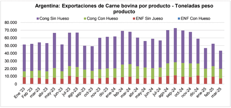 Las exportaciones del mes de marzo de 2025 alcanzaron un volumen cercano a las 43,4 mil toneladas peso producto de carne bovina refrigerada y congelada, por un valor del orden de los 205,9 millones de dólares. Con respecto al mes de febrero de 2025, los volúmenes embarcados muestran una significativa caída, del (-17,2%); mientras que el valor obtenido muestra un retroceso del (-20,1%).