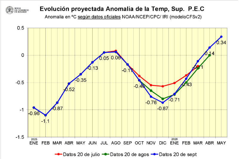 Con la siembra maicera en Argentina en marcha, peleando contra los excesos y buscando llegar a los lotes entre las tormentas que han ganado frecuencia semanal, la NOAA muestra una anomalía de la SST (temperatura superficial del mar) con un actual valor (setiembre) de -0,4, o sea casi saliendo de Neutralidad. La diferencia respecto a un mes atrás, es que la evolución proyectada de la anomalía en el mes de setiembre versus lo proyectado en agosto muestra valores de enfriamiento levemente mayores por debajo del umbral de -0,5. En agosto el valor más bajo se preveía en -0,8 para diciembre.