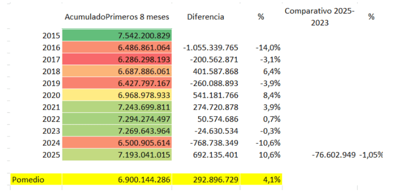 Incluso comparado con 2023 —año con condiciones productivas normales—, el volumen actual está 1% por debajo en el acumulado a agosto.