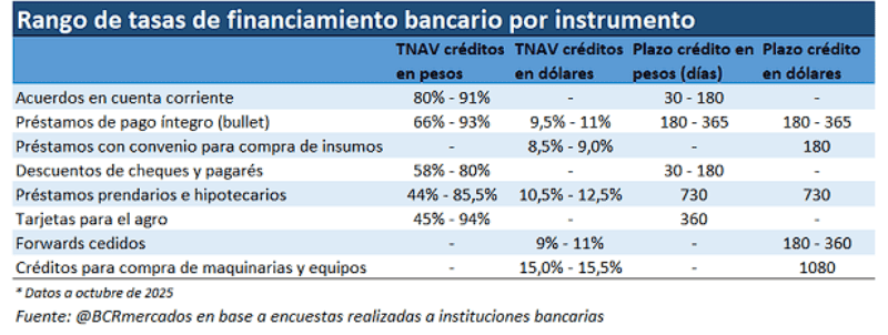 La siguiente tabla resume, para cada instrumento y plazo, la banda (límite mínimo y máximo) y una tasa promedio de mercado, ponderada por el monto nominal que se financió a cada tasa. Los datos corresponden a la semana finalizada el 24 de octubre de 2025. Cabe mencionar que este es un relevamiento general de tasas, el cual no se encuentra discriminado específicamente para el financiamiento al sector agro, sino que contemplan la totalidad de los créditos otorgados. A pesar de esto, constituye una referencia relevante, ya las tasas a las que efectivamente puedan financiarse los productores se encontrarán dentro de las bandas presentadas.