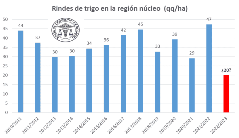 La sequía y las heladas golpean fuerte al trigo de la campaña 2022/2023 y, a las hectáreas que no se cosecharán en la región, hay que sumarle una caída notoria de rindes que proyectan los expertos. El rendimiento promedio de la región, tomando los últimos cinco ciclos, es de 39 qq/ha, y el peor rinde desde 2010 se ubica en 29 qq/ha. Lamentablemente, desde la GEA anticipan un rendimiento promedio para este ciclo de 20 qq/ha