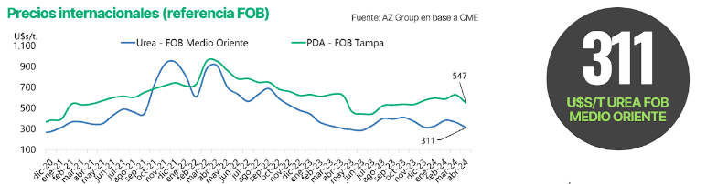En el mes de abril los precios de la urea en el mercado internacional se recortan nuevamente. La referencia FOB Medio Oriente cae 51 u$s/t. en el mes y se ubica en 311 u$s/t. En el Golfo, el FOB tuvo una reacción mayor, cayendo 74 u$s/t y alcanzando los 311 u$s/t. En Brasil, el CFR también se muestra en baja, alcanzando los 308 u$s/t, con una caída de 69 u$s/t. en el mes.