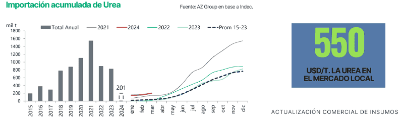 En lo que respecta a la urea, el autor del informe indicó que l año 2024 ha comenzado con volúmenes récord históricos de mercadería de urea ingresada al país. Según los datos publicados por el INDEC, hasta marzo se acumularon 202 mil t., marcando un volumen récord. Además, las 40.000 toneladas ingresadas en marzo representan otro récord para ese mes. Es importante tener en cuenta que tanto en 2022 como en 2023 las importaciones fueron mínimas en comparación con los valores históricos.