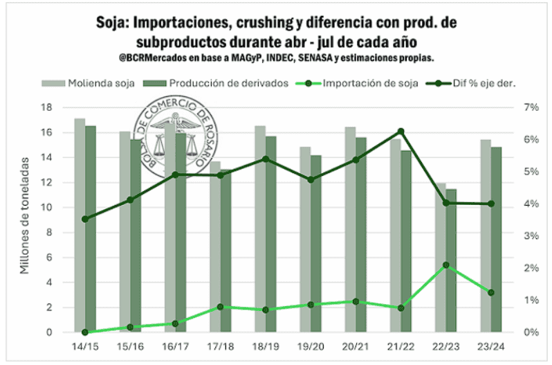 Con poco más de 15,4 Mt de soja procesadas, según los datos oficiales se habrían producido 14,8 Mt de subproductos minimizando la ratio de diferencia de extracción, que, a esta altura del año, llegaría a ser la más baja desde la campaña 2014/2015, lo que implica un mayor nivel de eficiencia para la producción de harina y aceite de soja, permitiendo obtener 0,96 toneladas de subproductos por cada tonelada de soja procesada.