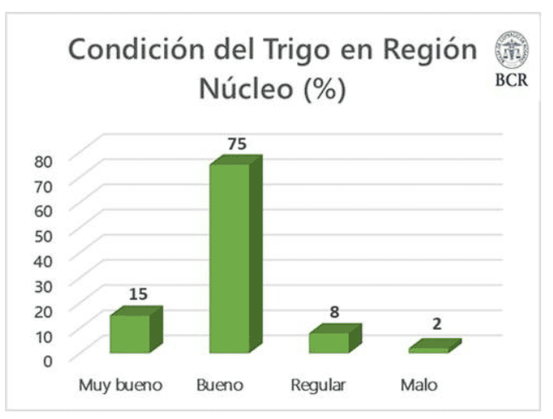 Del trigo sembrado en la Zona Núcleo, 2% está en mal estado, 8% regular, 15% se mantiene en muy buen estado y el resto bueno. La zona más afectada es el norte de Buenos Aires, específicamente el NE.