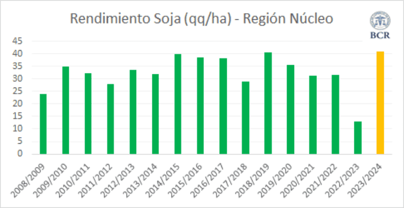 Los rindes de soja de la región núcleo muestran una seguidilla de años muy difíciles en los útlimos 5 ciclos. De atrás para adelante comienza con la trilogía de “La Niña” que muestra la peor marca, la del año pasado con 13,3 qq/ha y la de los dos anteriores con 31 qq/ha. Y siguen 35 qq/ha en la 2019/20 y luego sí una muy buena marca, la del 2018/2019 —tras la brutal sequía del 2017/18— con 40,7 qq/ha. Esa era la mayor marca para la región desde que GEA/BCR monitorea la región núcleo, la cuál sería ya superada por esta nueva estimación 2023/24 con 41,2 qq/ha.