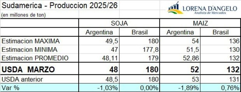 En soja, el organismo redujo su cálculo para Argentina de 48,5 a 48 millones de toneladas, en línea con la evolución de la campaña y las estimaciones de los analistas privados, que ubican la producción promedio en 48,11 millones de toneladas, aunque algunos pronósticos del sector aún proyectan volúmenes superiores.