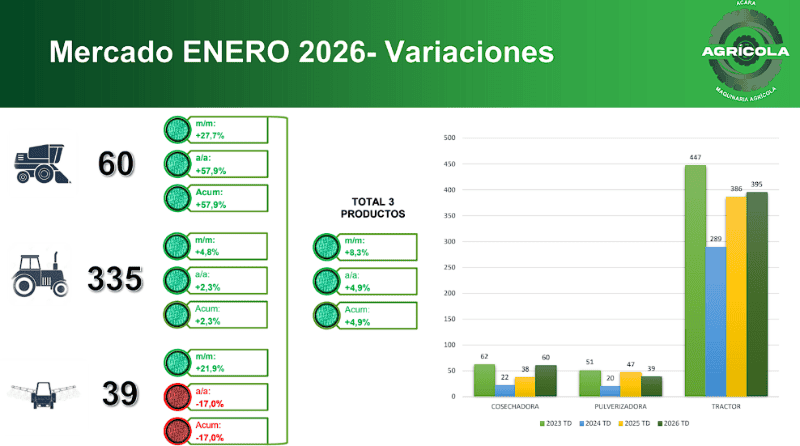 El mercado de maquinaria agrícola comenzó 2026 con señales positivas. De acuerdo con el informe mensual de patentamientos de la Asociación de Concesionarios de Automotores de la República Argentina (ACARA), durante enero se registraron 494 unidades patentadas entre cosechadoras, tractores y pulverizadoras, lo que representa una suba del 8,3% respecto de diciembre de 2025 y un incremento interanual del 4,9% frente a enero del año pasado .