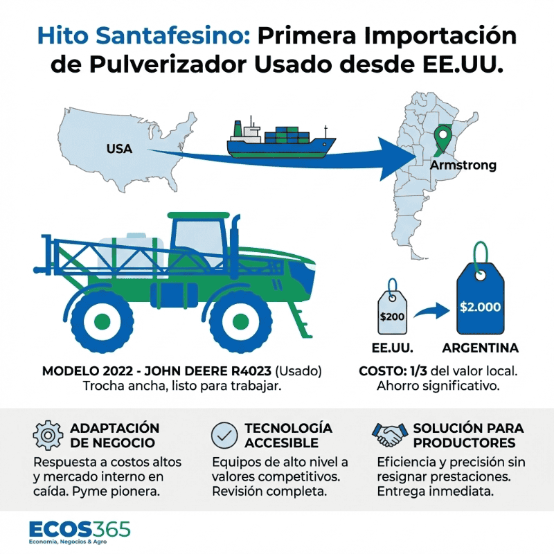 La empresa Distribuidora Italia, radicada en la ciudad de Armstrong, concretó recientemente la primera importación de un pulverizador agrícola usado proveniente de Estados Unidos, en una operación que refuerza su estrategia de reconversión comercial y la posiciona como pionera dentro del sector.