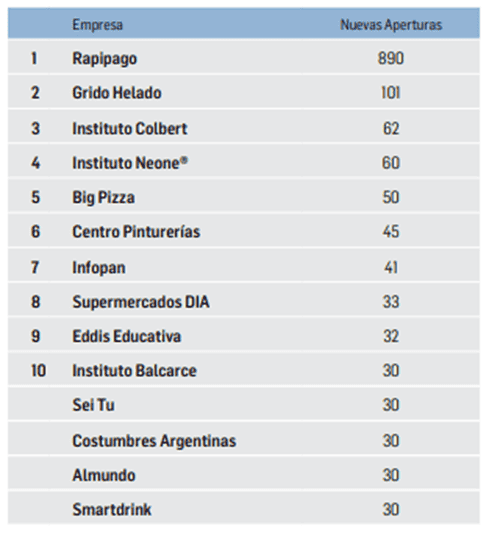 El siguiente gráfico indica el ranking de las empresas que más aperturas realizaron de nuevas franquicias: