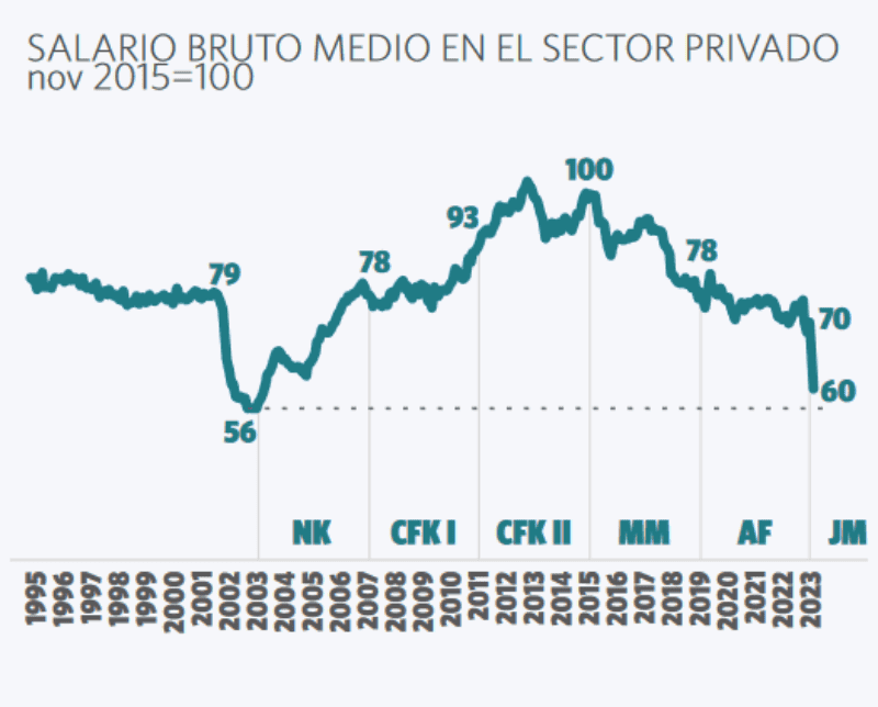 Según el análisis, el poder adquisitivo quedó a muy poco del mínimo histórico alcanzado en abril de 2003.En consecuencia, el salario promedio del trabajador registrado en el sector privado cayó por debajo de la línea de pobreza.