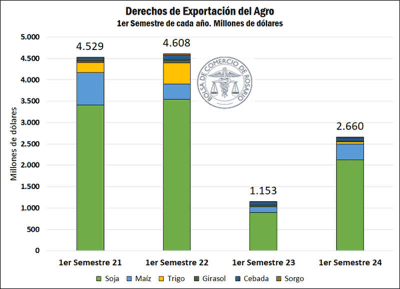 Entre enero y junio, de acuerdo a expertos de la Bolsa de Comercio de Rosario (Tomás Rodríguez Zurro – Natalia Marín – Julio Calzada) se estima que el agro aportó u$s 2.660 millones por DEX a las arcas del Tesoro. La cifra más que duplica el aporte de los primeros seis meses del 2023, con un estimado de u$s 1.153 millones en ese período.