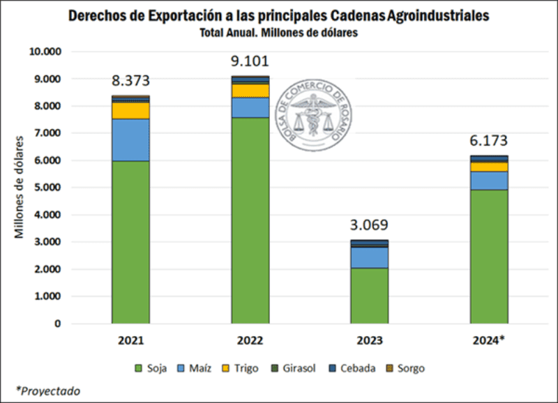 Luego de la histórica sequía que azotó a Argentina durante la cosecha de granos 2022/23 y que dejó como saldo una pérdida productiva de más de 50 Mt, la recuperación productiva del ciclo 2023/24 trae aparejado un mayor aporte de las principales cadenas del agro en materia de Derechos de Exportación (DEX), dada la persistencia del cobro de este tributo al sector.