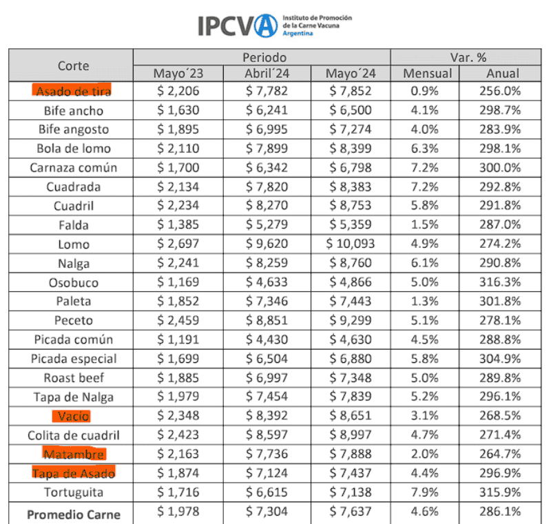 De acuerdo al reporte elaborado en base a un trabajo de campo llevado a cabo en carnicerías y supermercados, cortes como matambre, vacío, asado de tira y tapa de asado, registraron aumentos entre mayo de 2023 y 2024.