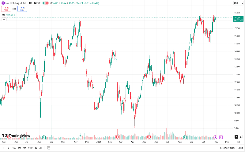 Pocos ejemplos encarnan mejor esta dinámica en la actualidad, y con tanta relevancia para nuestra región, como Nu Holdings (NYSE: NU), la nave nodriza detrás de Nubank. Lo que comenzó como una startup con una tarjeta de crédito color morado se ha transformado en un gigante financiero que está desafiando el establishment bancario en América Latina. Para muchos, es un servicio en su celular; para el mercado, es una de las tesis de inversión más potentes y polarizantes de la última década. La compañía se encuentra en una fase de expansión y monetización vibrante, un hecho que se refleja en una valoración exigente que, al menos por ahora, el mercado parece más que dispuesto a convalidar. Con la acción consolidando en la zona de los $16.10 a $16.20 dólares hacia finales de octubre de 2025, la pregunta que resuena en las mesas de análisis es si los fundamentos realmente respaldan el optimismo que dibuja el gráfico.