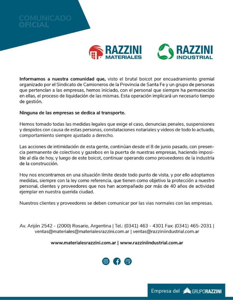 Las empresas del Grupo Razzini se encuentran trabajando a puertas cerradas luego de sufrir un bloqueo por parte del sindicato de Camioneros a raíz de un conflicto sindical. Se trata de dos espacios, una planta recicladora donde procesan residuos de construcción (escombros/hormigón) y un corralón de materiales para la construcción que hoy no están pudiendo funcionar normalmente. Desde la firma destacan que la situación está en manos de la Justicia y que, de no resolverse, consideran mudarse para operar en el vecino país de Paraguay.