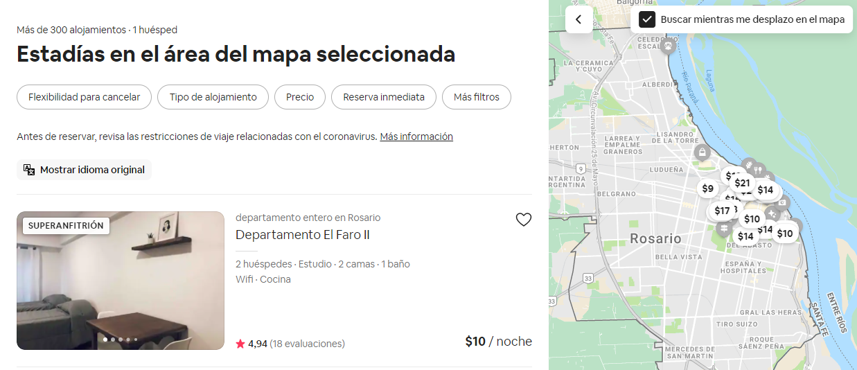 En Booking en la actualidad pueden encontrarse 129 alojamientos para alquiler temporario en Rosario con tarifas en pesos y que varían según la cantidad de noches que el usuario quiera estar.